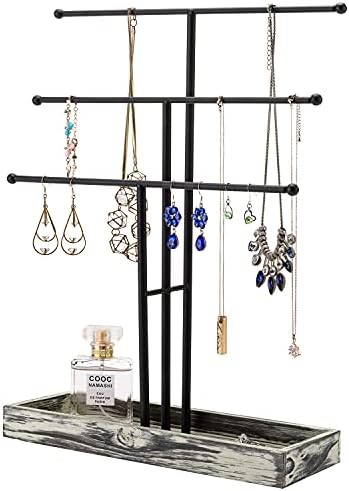 MyGift 3-Tier Black Metal T-Bar Jewelry Organizer Stand, Necklace and Bracelet Hanging Display with Rustic Gray Wood Ring Tray** ** ** **